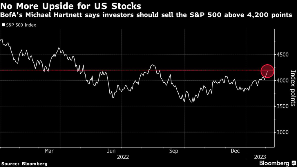 Hartnett recommends investors start selling the S&P 500 when it’s over 4,200 points — 0.5% higher from its most recent close.