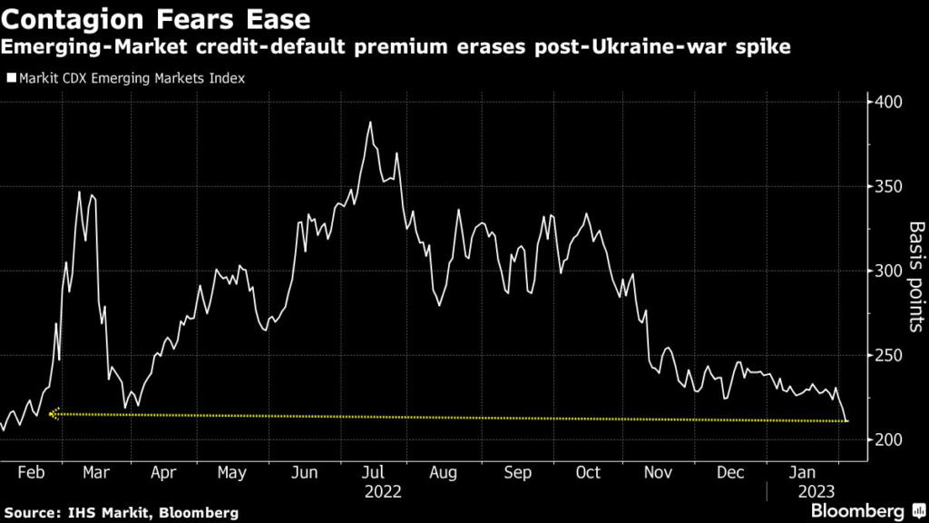 The cost of hedging against a default by 18 emerging economies from China to Panama declined to 211 basis points on Friday, according to IHS Markit data, the least since before Russia invaded Ukraine last February.
