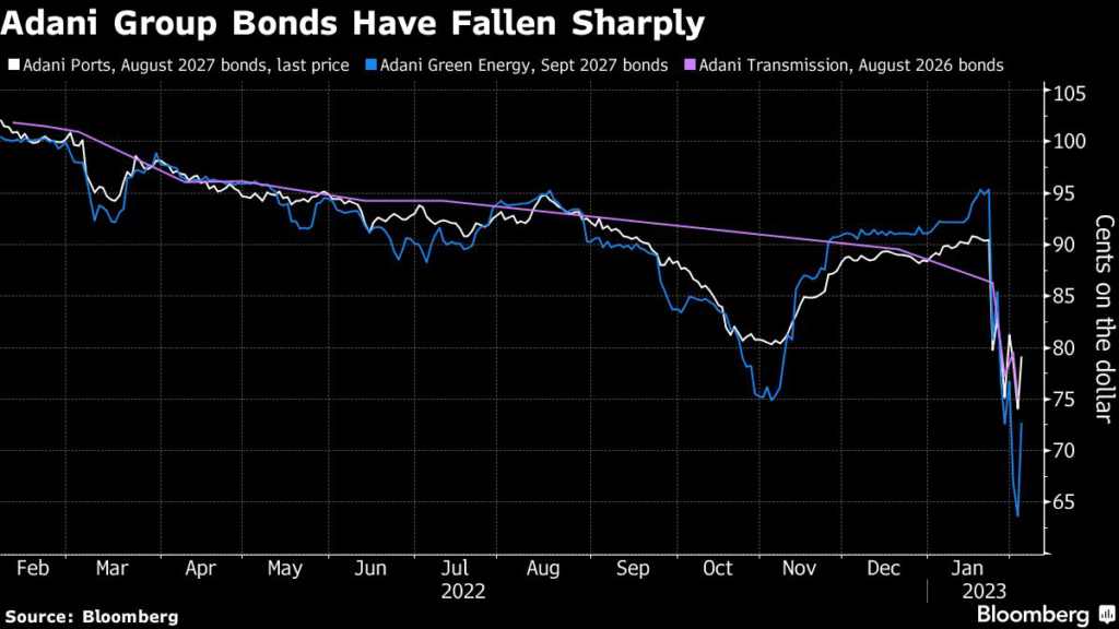 Adani Ports and Special Economic Zone Ltd’s August 2027 bonds dropped to around 71 cents on the dollar and Adani Green Energy’s September 2024 obligation fell to some 64 cents at one point. They have since rebounded amid constructive calls from some sell-side strategists.