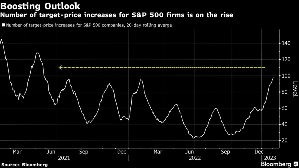 Sell-side analysts who cover the S&P 500 companies — and already skew bullish — have responded by raising their share-price estimates at the fastest pace since the spring of 2021.