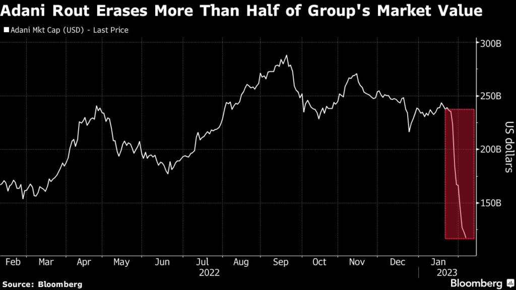 and Adani Total Gas Ltd. leading the losses. The meltdown since US short-seller Hindenburg Research made fraud allegations against the ports-to-power group in a Jan. 24 report has wiped out $117 billion, or almost half of the market value of its companies.