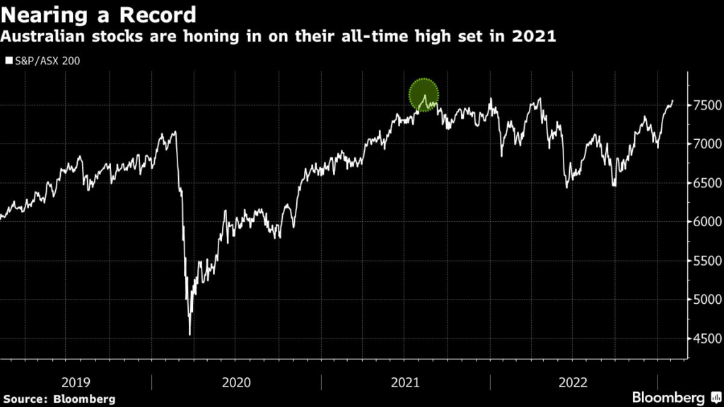 The country’s S&P/ASX 200 Index is about 1% from its August 2021 peak after a rebound on China’s reopening and a wider recovery from last year’s global rout.