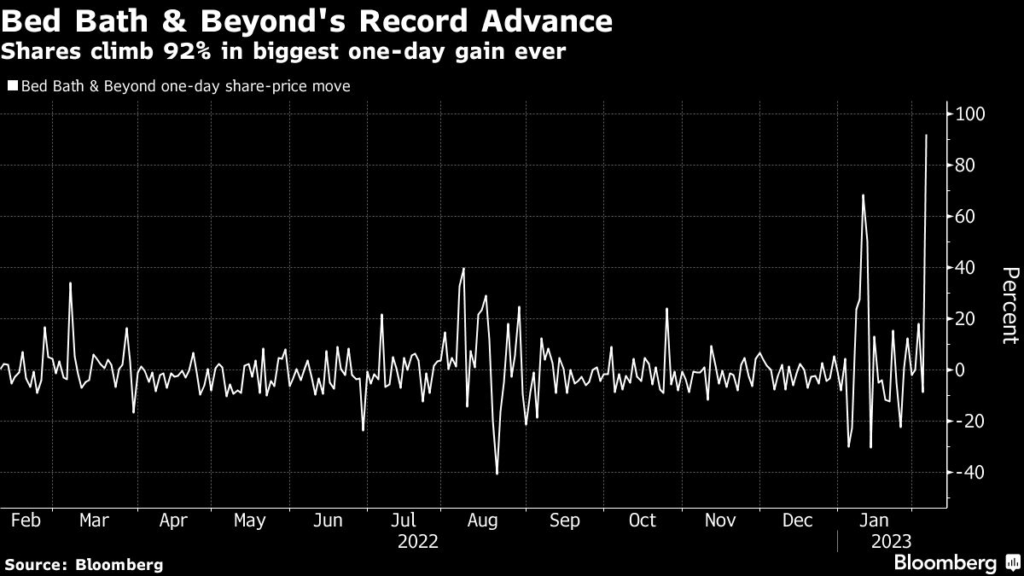 Bed Bath & Beyond shares triggered at least two volatility-related trading halts during the ascent.