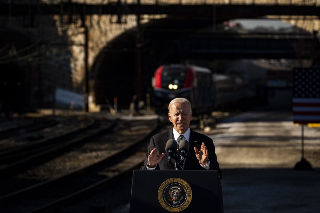 Last week in Baltimore, Biden spoke from a stage positioned between the American flag and an Amtrak train that blared its horn as he finished his speech.