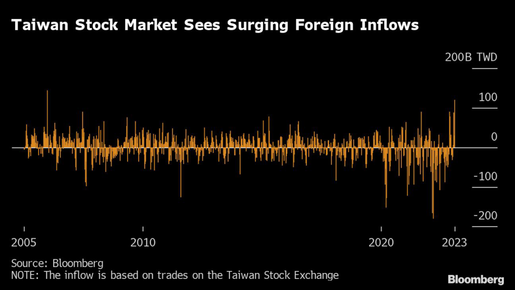 (Bloomberg) — Foreign investors net bought NT$120 billion ($4 billion) worth of Taiwanese stocks last week, the most since 2005, Bloomberg data shows.