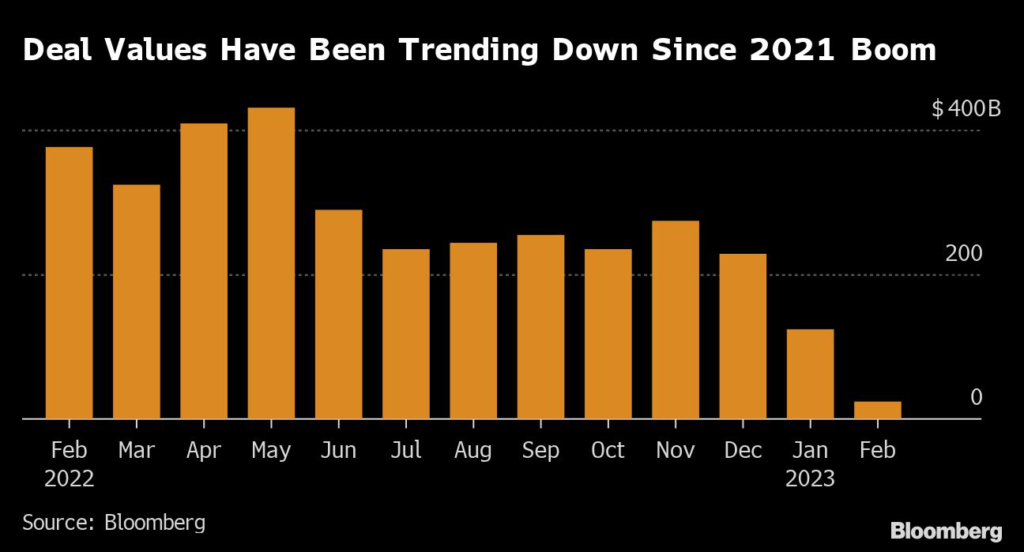 At about $124 billion, global deal values in January were the lowest for an opening month since 2003.