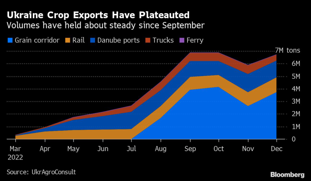 The volume of crops cleared on ships from Ukraine fell to 3.1 million tons in January, holding shy of its 5-million ton goal.