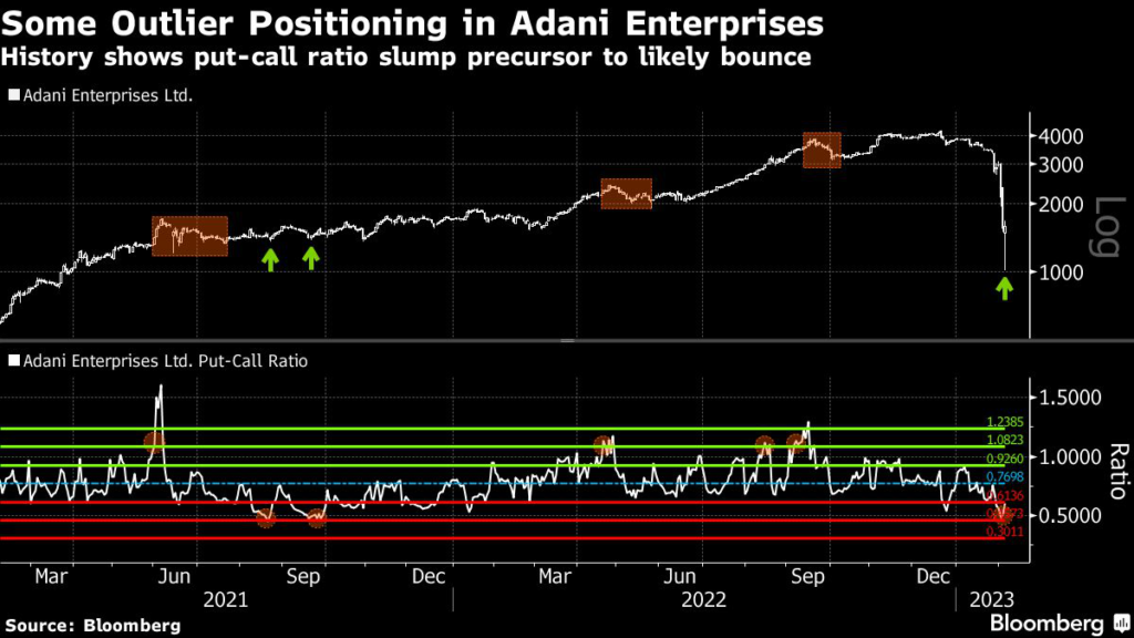The ratio of put-to-call options on Adani Enterprises as measured by open interest slid to a six-month low amid last week’s rout, briefly dropping to about two standard deviations below the 24-month average.