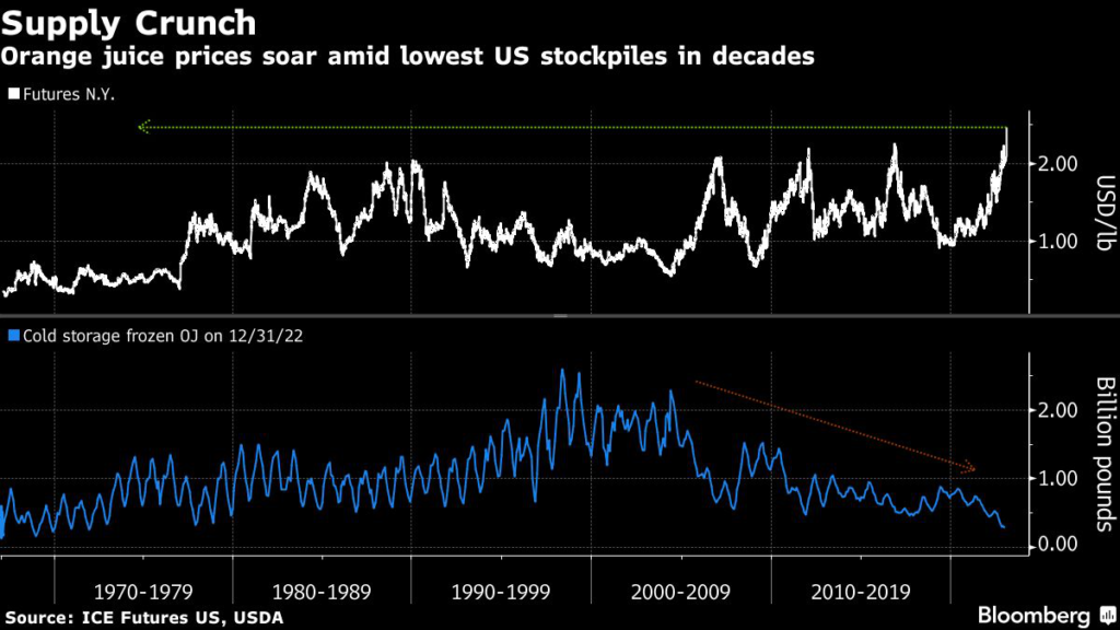 It exacerbated long-term impact from the devastating citrus-greening disease that’s sent costs soaring as well. Greening makes fruit shrivel and reduces yield, eventually killing trees.