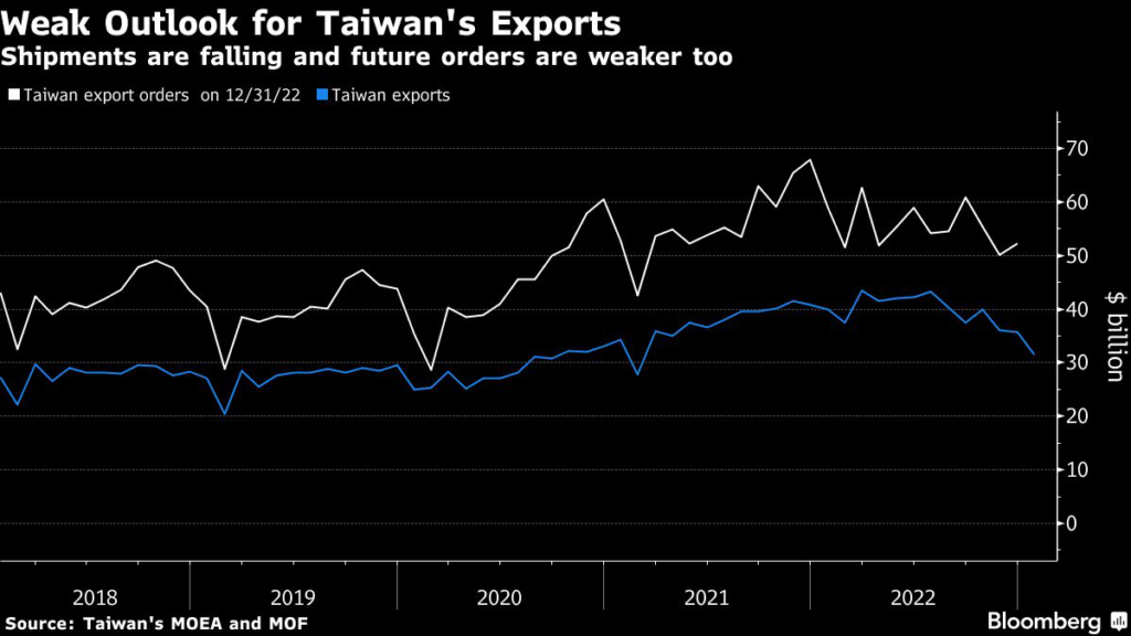 Overseas shipments declined 21.2% in January from a year ago to $31.5 billion, the lowest since February 2021, data from Taiwan’s Finance Ministry showed Tuesday.