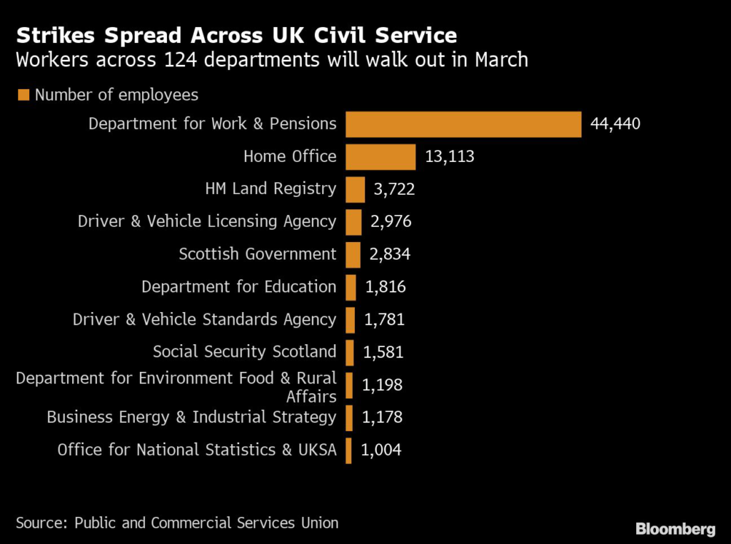A ballot for 33,000 workers at His Majesty’s Revenue & customs is due on Feb. 28, and strikes could also be called for mid-March.