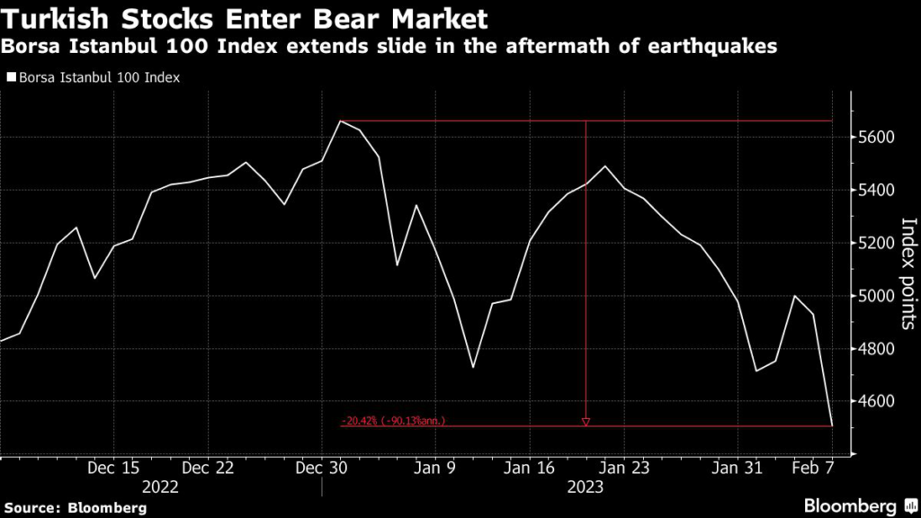 Turkish stocks slumped, closing in a bear market, as the country struggles with the aftermath of two devastating earthquakes, with a three-month state of emergency declared for affected areas.