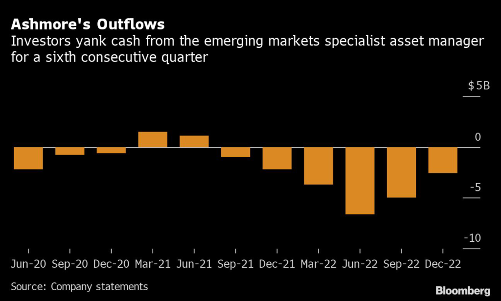 (Bloomberg) — Ashmore Plc’s profits slumped in the second half of last year as the asset manager saw clients pull billions from its funds.