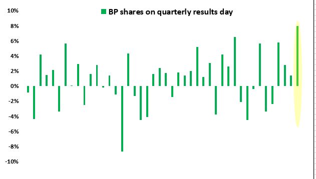 Tuesday’s gain was the biggest for BP’s stock on any quarterly results day for at least a decade, according to data compiled by Bloomberg.