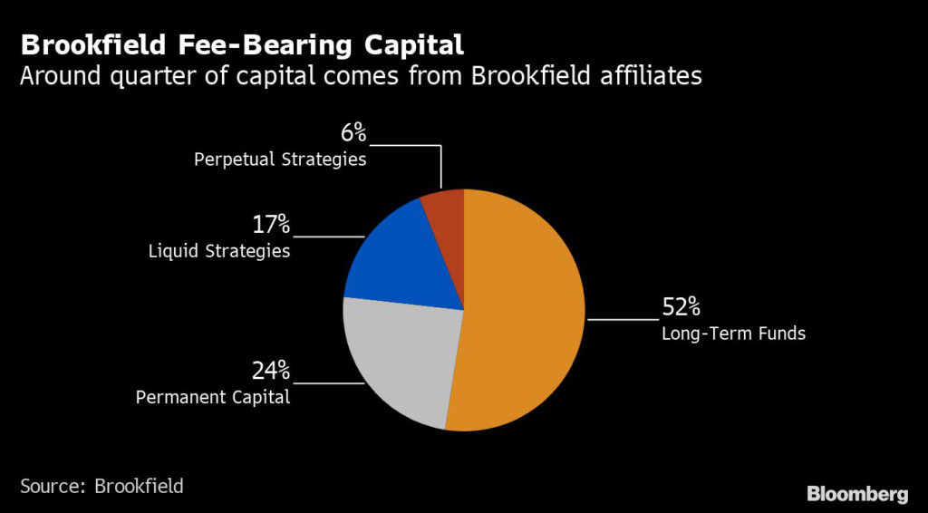 About a quarter of that total comes comes from other entities in the corporate family, including Brookfield Infrastructure Partners, Brookfield Renewable Partners and its insurance platforms.