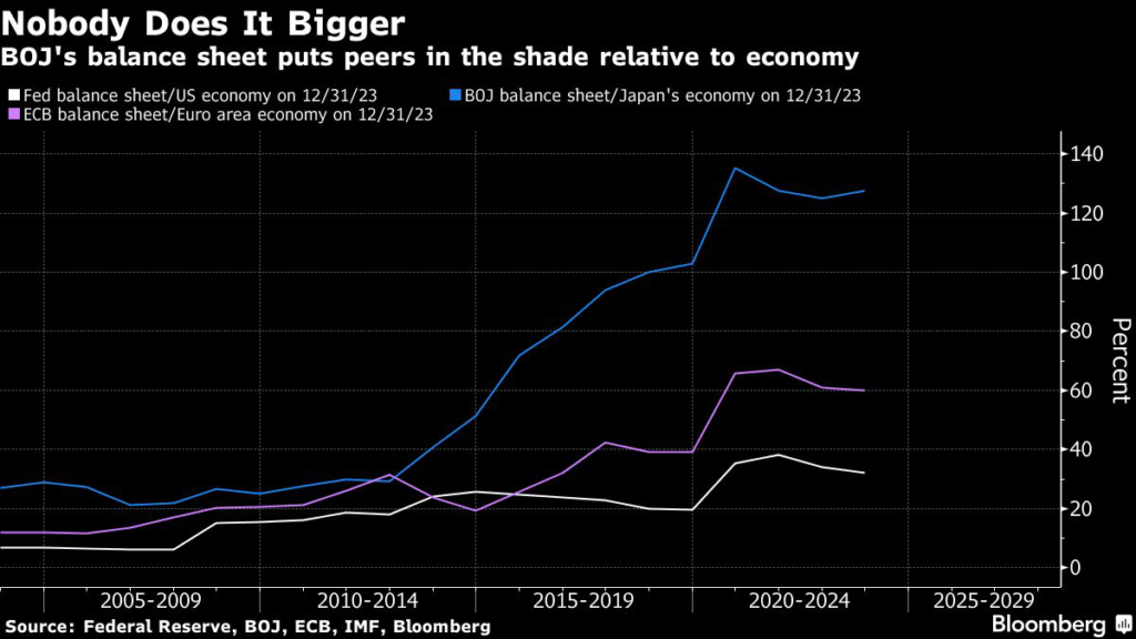 The BOJ’s balance sheet was once about the same size relative to the economy as for the Federal Reserve and the European Central Bank.