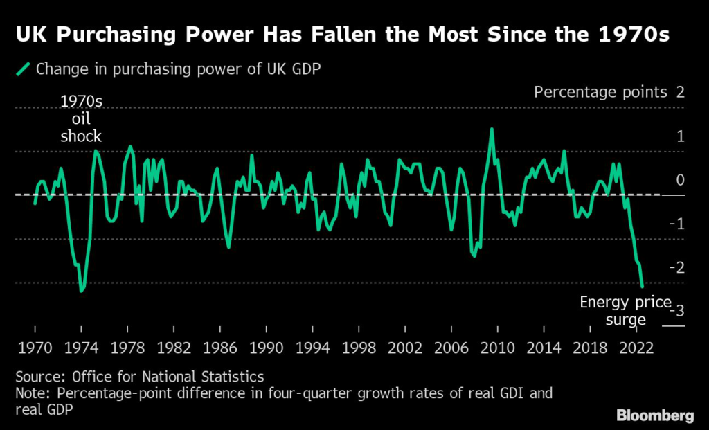 (Bloomberg) — The UK economy suffered the biggest loss of purchasing power since the 1970s oil crisis after Russia’s invasion of Ukraine sparked a surge in energy prices.