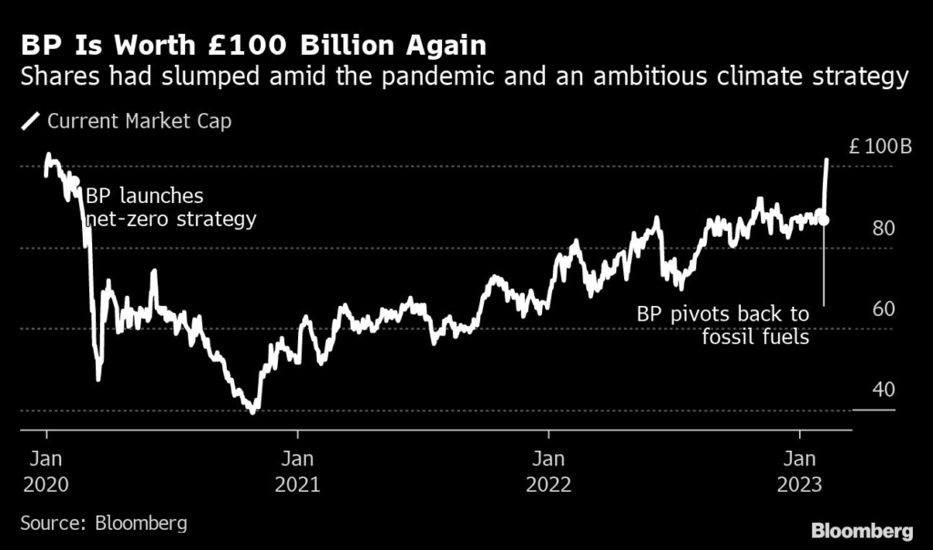 BP Plc’s market capitalization rose above £100 billion ($121 billion) for the first time in three years as shareholders rewarded the company for a pivot back toward its fossil-fuel origins.
