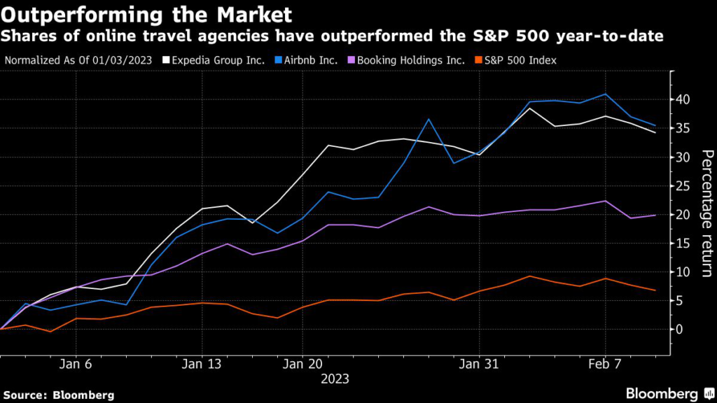 Its stock gains have made it the 13th-best performer in the S&P 500 in the year through Thursday. Shares of Airbnb Inc., which reports results Feb. 14, have risen about 34% in 2023, while Booking Holdings Inc., due on Feb.