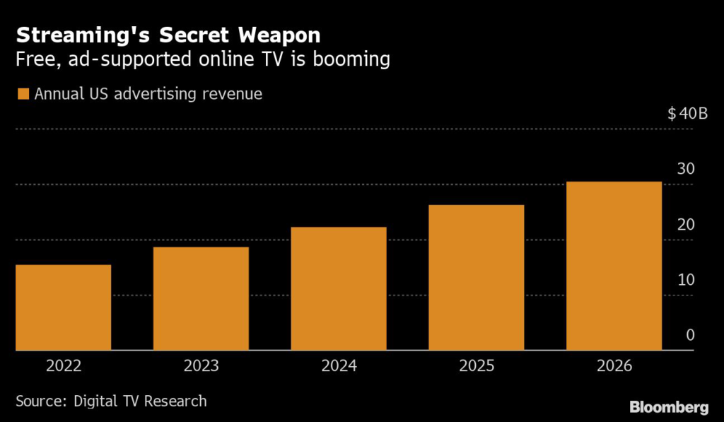 Revenue at Tubi and other advertising-based video-on-demand, or AVOD services, such as Paramount Global’s Pluto, Roku and Amazon.com Inc.’s Freevee, is expected to double to $30 billion in the US by 2026, according to Digital TV Research.