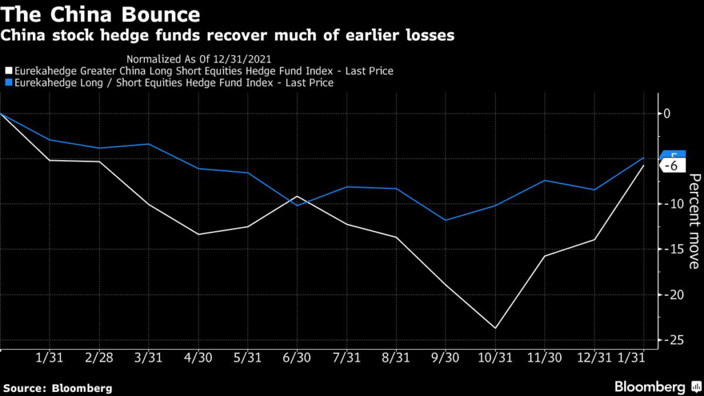 A Eurekahedge Pte measure of China stock hedge fund performance jumped 24% in the three months through January, four times that of the global average.