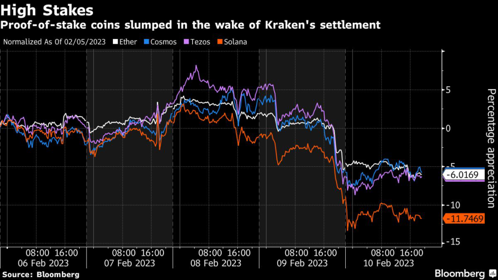 “An SEC settlement with Kraken, shuttering its staking operation, puts this entire growth pillar at risk for Coinbase,” said Bloomberg Intelligence analysts Paul Gulberg and Jamie Douglas Coutts in a note Friday.