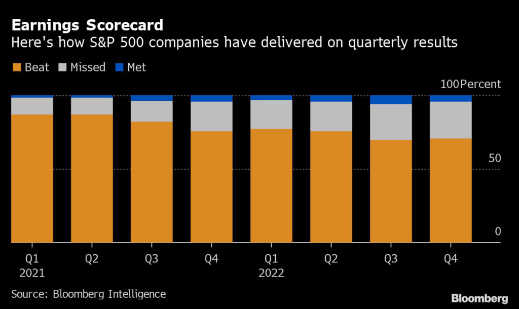 With the bulk of quarterly reports in, the per-share earnings of the companies in the S&P 500 Index were down 2.3% during the last three months of 2022, the first decline since the third quarter of 2020, according to data compiled by Bloomberg Intelligence.