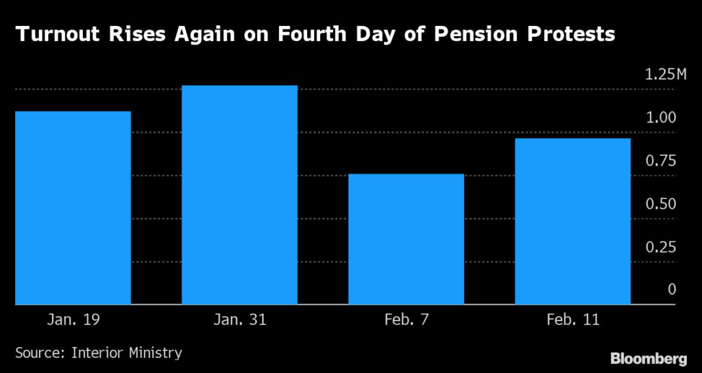 (Bloomberg) — French labor unions threatened to bring the nation to “a halt” in March as the number of protesters against government pension reform swelled to about 1 million on Saturday.