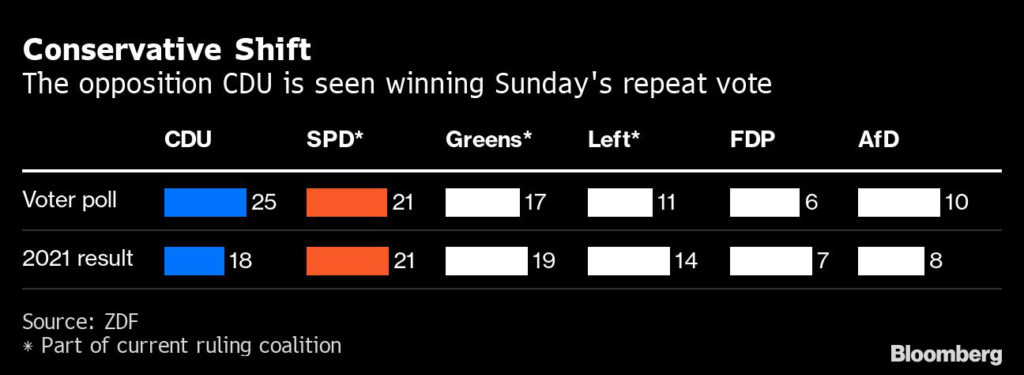 Preliminary results are expected at 6 p.m. Sunday in Berlin. The CDU is projected to win the biggest share of the vote on 25%, up from 18% in 2021, according to a poll by Forschungsgruppe Wahlen for public broadcaster ZDF published late Thursday.