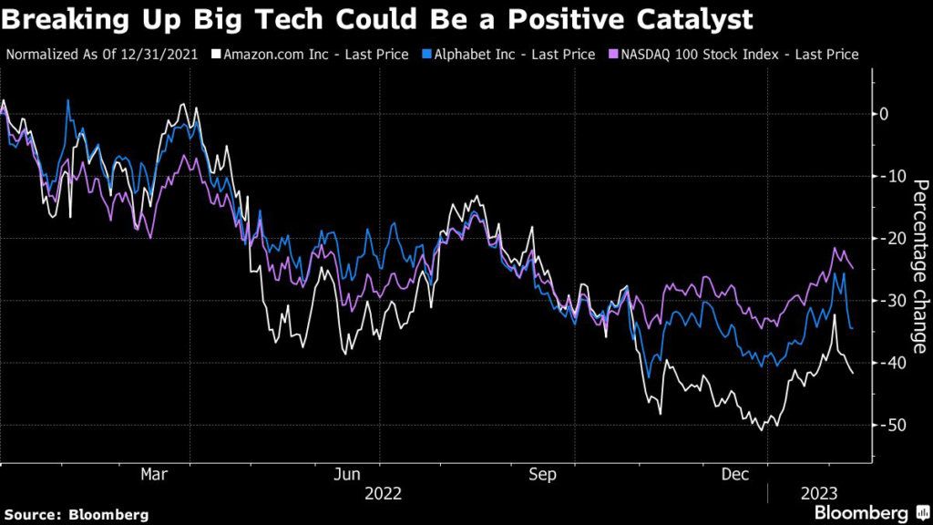 (Bloomberg) — With big tech companies facing weaker growth trends and an economic outlook that could prevent the group from regaining its leadership role in the market, revived antitrust fervor might seem to be the last thing they need.