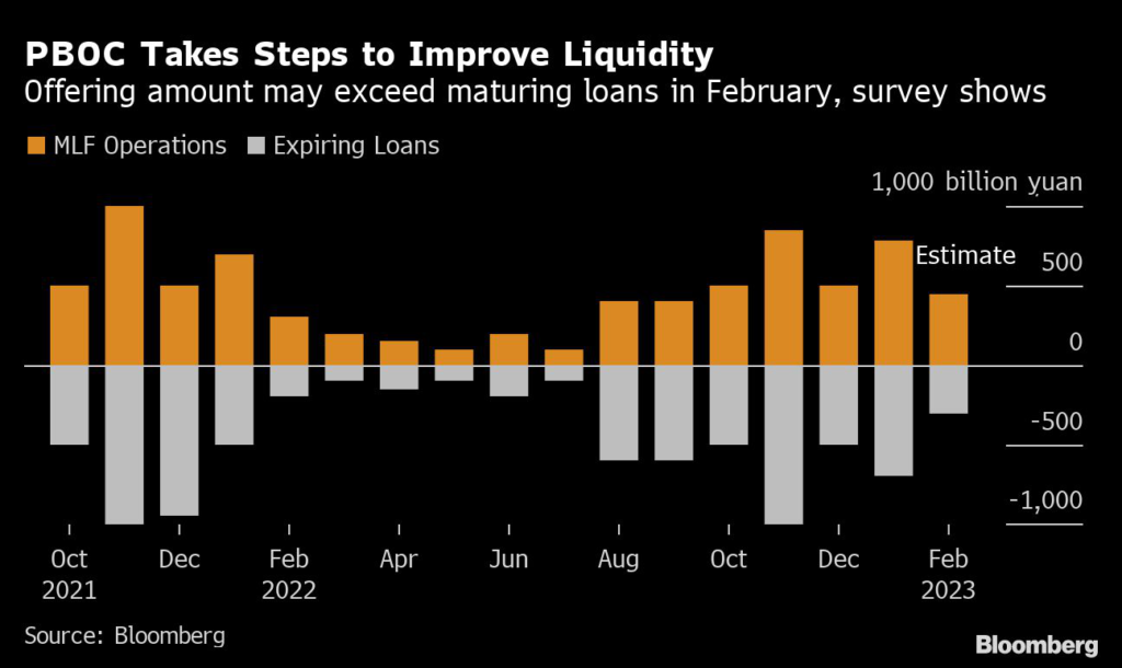 Wang Yifeng, an analyst at Everbright Securities Co., expects a net injection of 400 billion yuan via MLF this month, followed by another liquidity boost of 300 billion yuan in March.