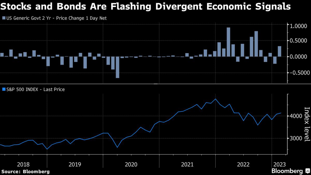 (Bloomberg) — For the first time in a long time, stock and bond markets are flashing divergent signals on the economy and future Federal Reserve policy.