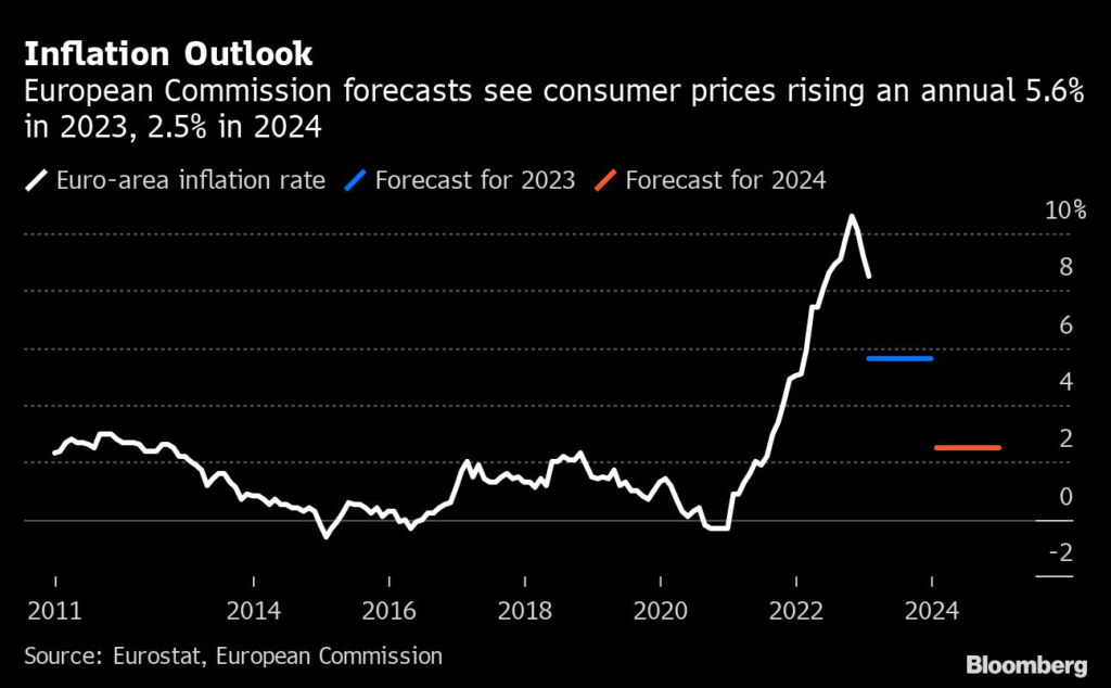 (Bloomberg) — The euro-zone economy will fare better this year than previously feared as a mild winter and high levels of gas storage help to ease the energy crisis, and the labor market holds up, according to the European Commission.