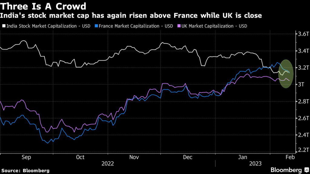 (Bloomberg) — India has reclaimed fifth place among the world’s top equity markets by value after being briefly usurped by France during a selloff of Adani Group shares.
