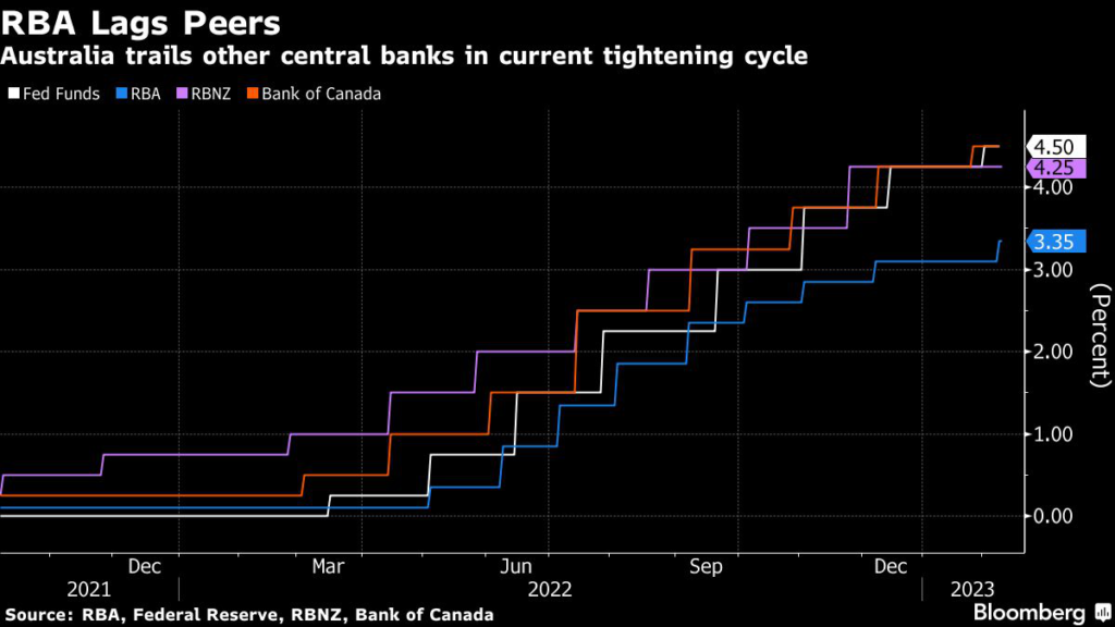The RBA has raised rates by 3.25 percentage points in nine consecutive meetings since May from a record low 0.1%, and has said further hikes are in the offing.