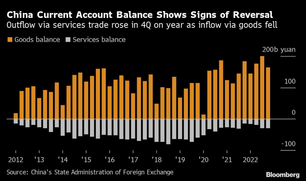 On the services side, the trade deficit surged 89% in the final quarter of 2022 from a year ago, the first time it’s widened since the end of 2018.