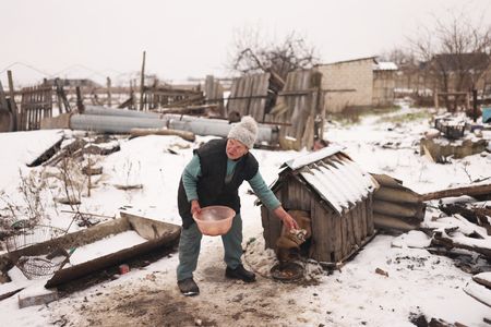 Volodymyr cycles to nearby shops for food, sometimes supplemented by packages handed out by charities. The couples chop wood for their stoves and collect rain water from the roof in a bucket or from the village well if the generator is working.