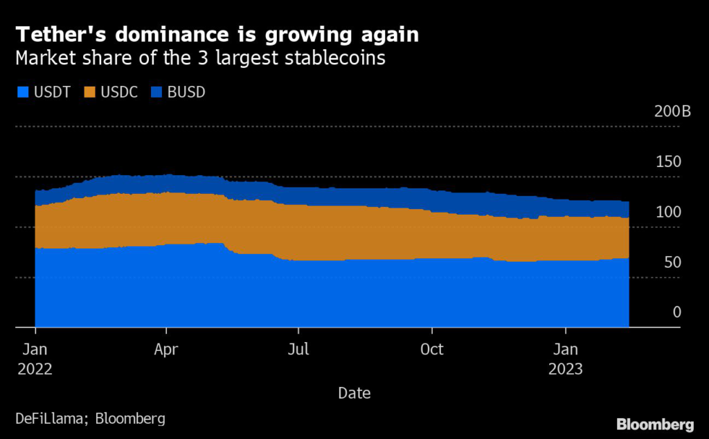 Tether Holdings Ltd’s USDT — the world’s largest stablecoin — increased its market share by about $1 billion in the past 24 hours alone, as some traders move their holdings out of rivals following a series of enforcement drives by financial watchdogs in the US.