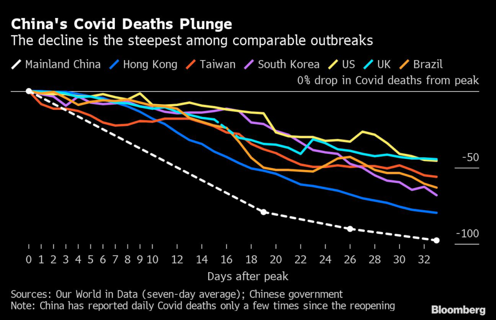 China is posting the steepest drop in Covid deaths among more than 20 places hit hardest by omicron, reviving questions about its virus data and the true impact of the reopening wave as Beijing works to move on from the pandemic.