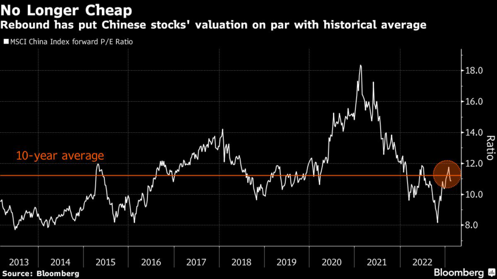 The MSCI China Index is trading at about 11 times forward one-year earnings, just shy of its 10-year average. That compares to 8.1 times when the benchmark was at its nadir in late October.