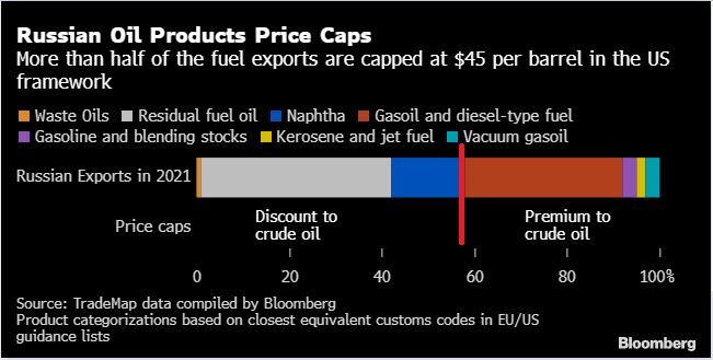 More than half of Russia’s refined fuel exports have been capped at $45 a barrel, highlighting the potential pressure the nation’s oil industry could face from the latest Group of Seven sanctions.