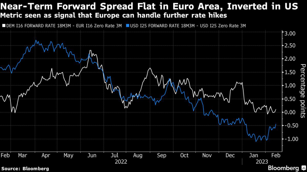 “It’s consistent with the idea those economies are entering recession. In Europe, it’s relatively flat — a signal that Europe can handle higher rates.”