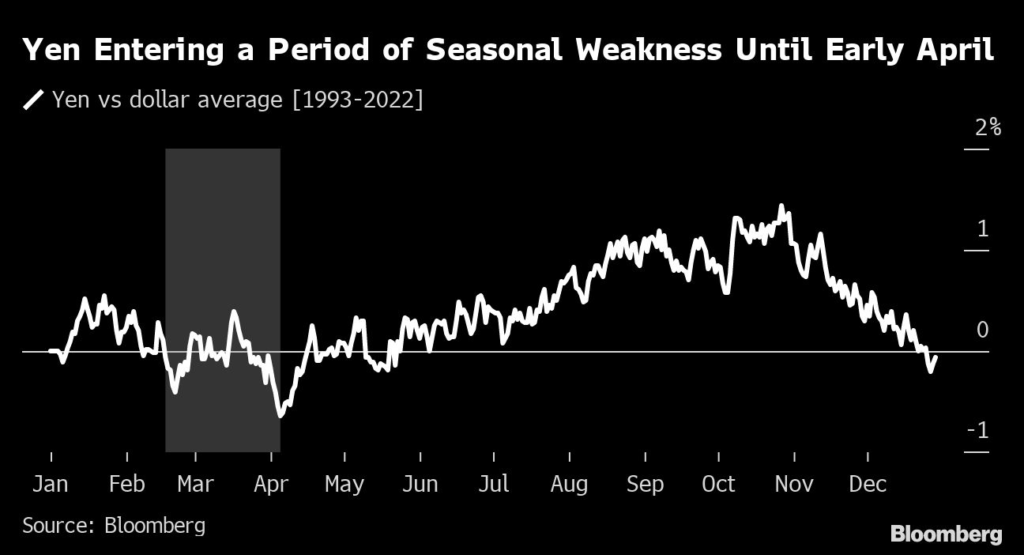 The yen has just entered a traditionally weak time of the year, which lasts until early April, according to historical data compiled by Bloomberg.
