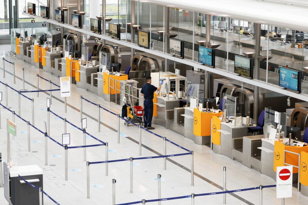Verdi workers paraded through virtually empty airport halls in Frankfurt on Friday, clad in high-vis vests and waving flags.