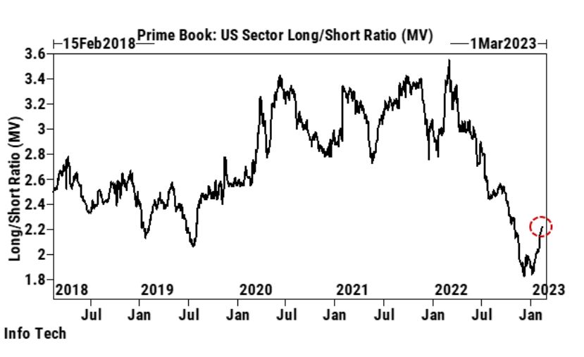 While unwinding short sales dominated flows during the first week of February, the group has added to long positions in recent sessions — a sign of growing conviction in the information technology sector.