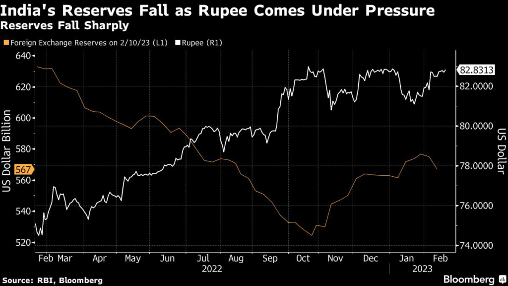 India’s foreign exchange reserves fell the most in more than 10 months on likely dollar sales by the country’s central bank to stabilize the rupee under pressure from equity outflows exacerbated by the rout in Adani Group companies.
