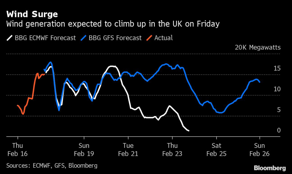 (Bloomberg) — The first named storm of this year is heading for the UK and northwest Europe, threatening to bring havoc to infrastructure as well as a surge in wind power production on Friday.