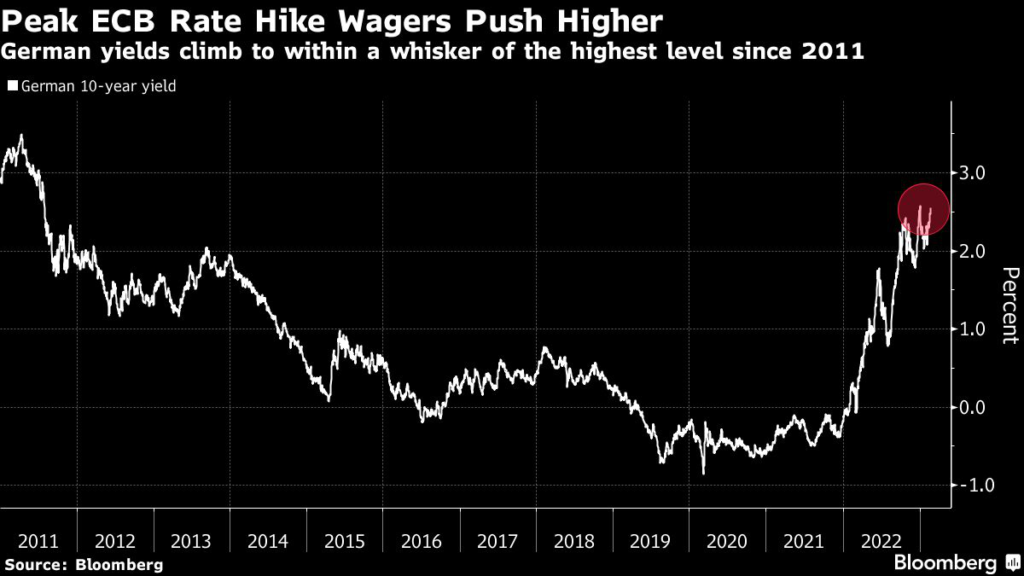 (Bloomberg) — German bonds erased losses and money markets trimmed bets on further European Central Bank tightening after Bank of France Governor Francois Villeroy de Galhau said rate bets have been excessively volatile.