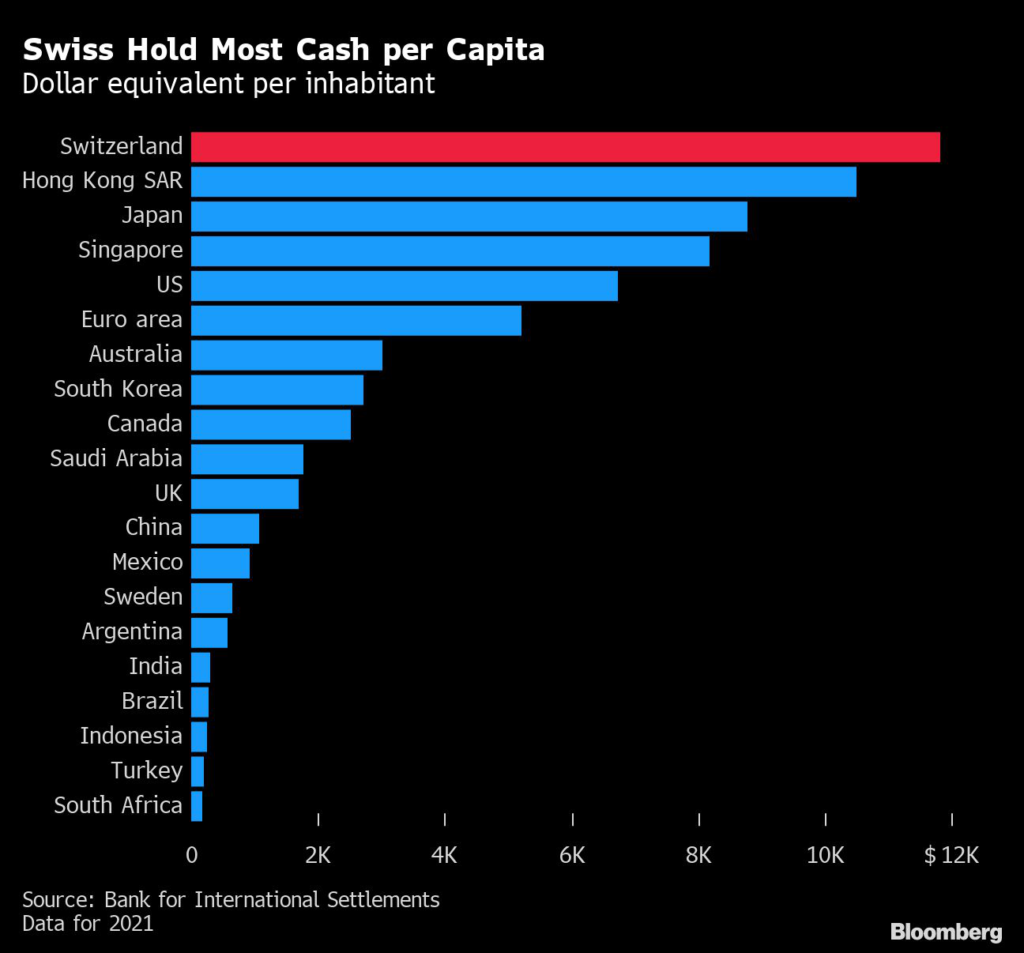 Even so, the initiative highlights how emotive the issue of physical money is in Switzerland. Every inhabitant holds the equivalent of $11,824 in cash, the most in all economies where the Bank for International Settlements collates data.