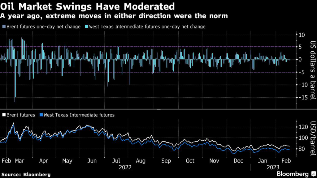 Whereas the market faced extreme swings after the invasion, when daily moves of $5 a barrel or more were common, improved liquidity today has contributed to more modest fluctuations. Both global benchmark Brent and West Texas Intermediate futures have been trading in narrow bands, with neither finding the momentum to break above their 100-day moving averages for any sustained duration in months.
